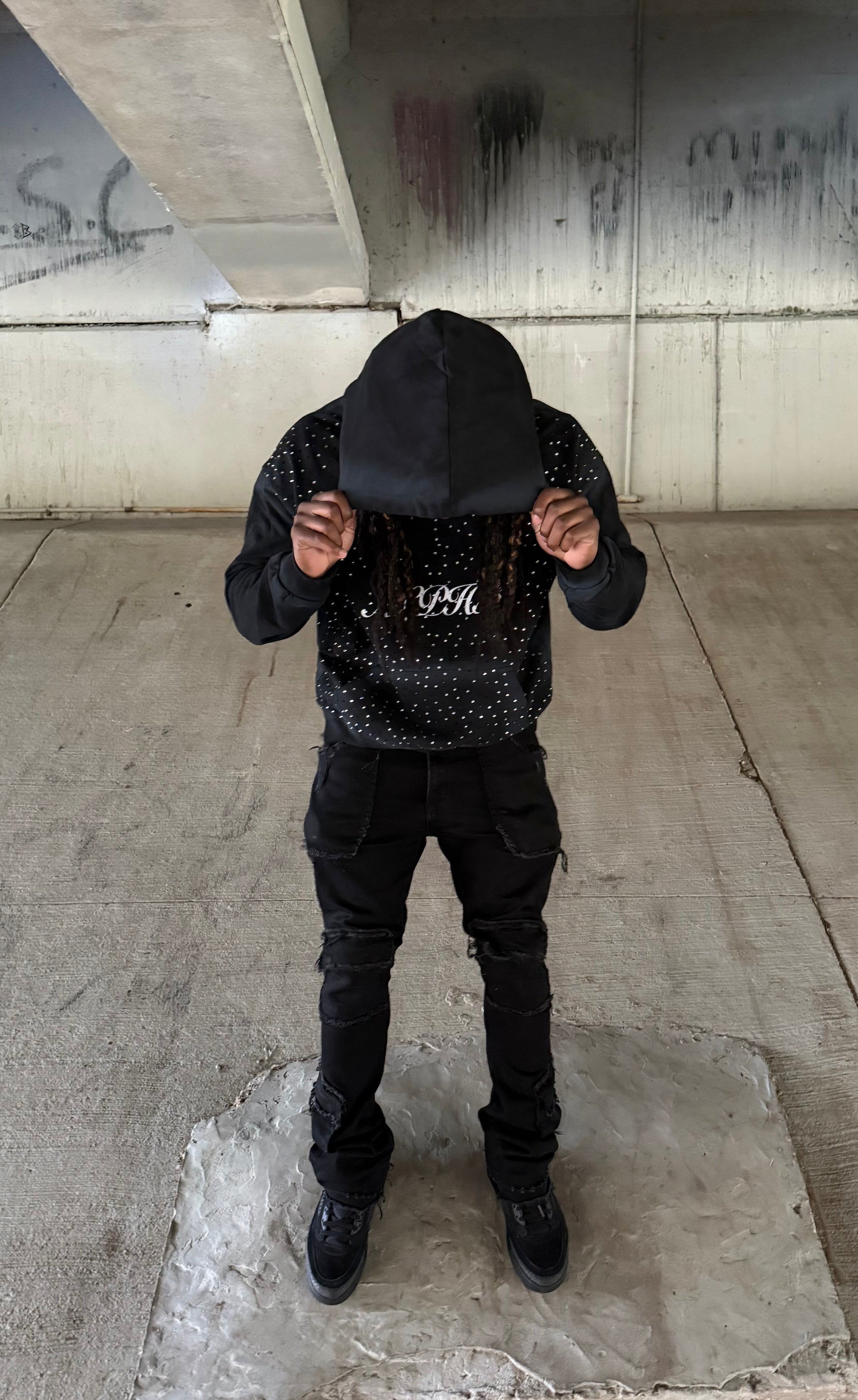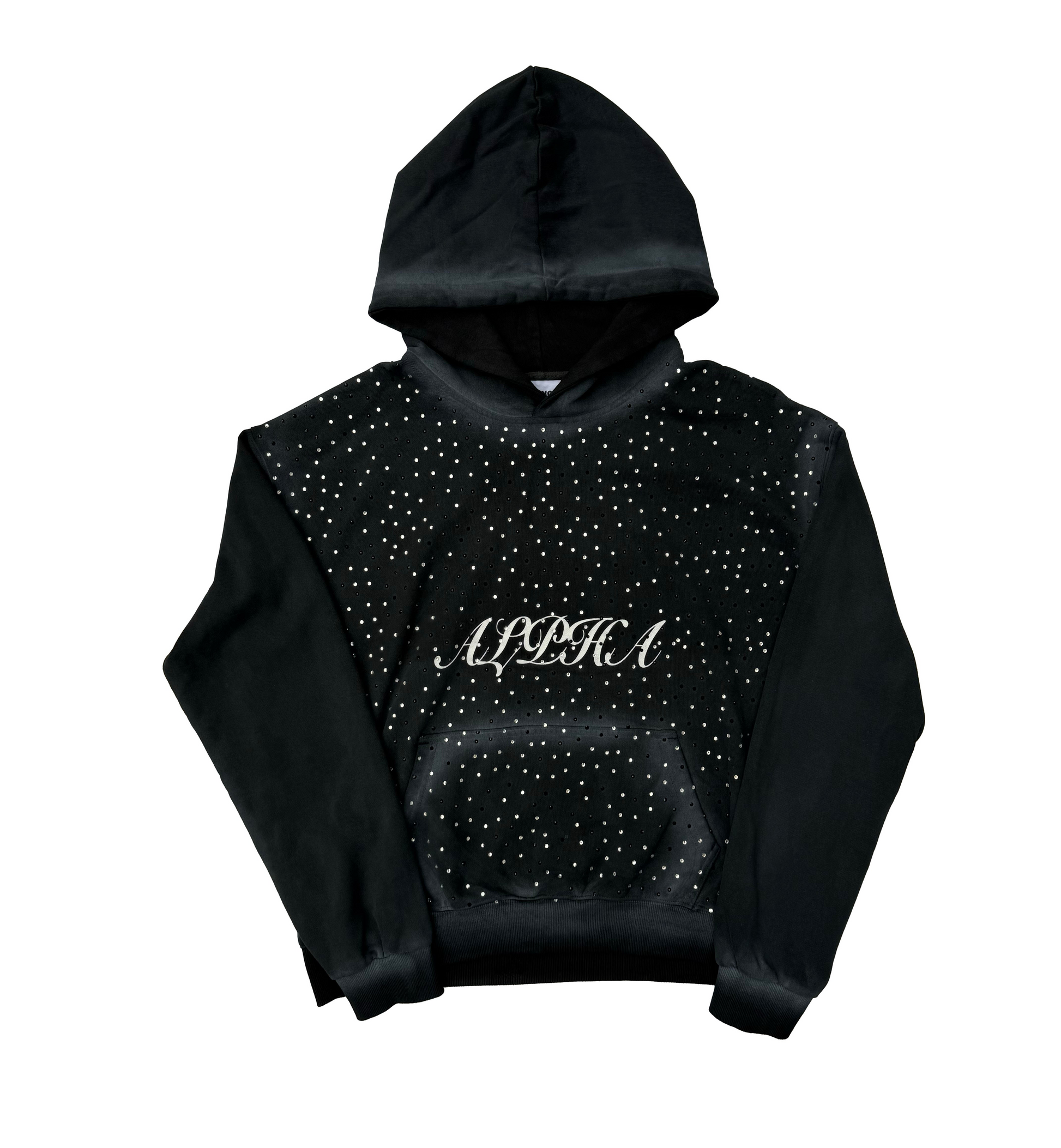 Oversized fitted hoodie with a black ombré dirt effect giving you that streetwear look. Following with the rhinestones that stand out with a unique print on the back.